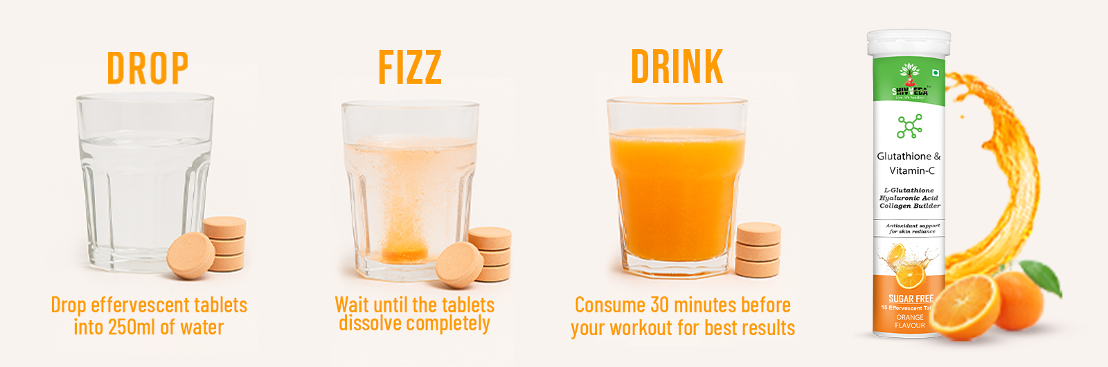 Drop Shivveda’s Glutathione & Vitamin - C effervescent tablet into 250 ml of water and let it dissolve completely. Consume 30 minutes before your workout or after meals for best results. Regular use of these tablets helps to improve skin tone, hydration, and glow. Maintain a balanced diet and skincare routine for optimal benefits.